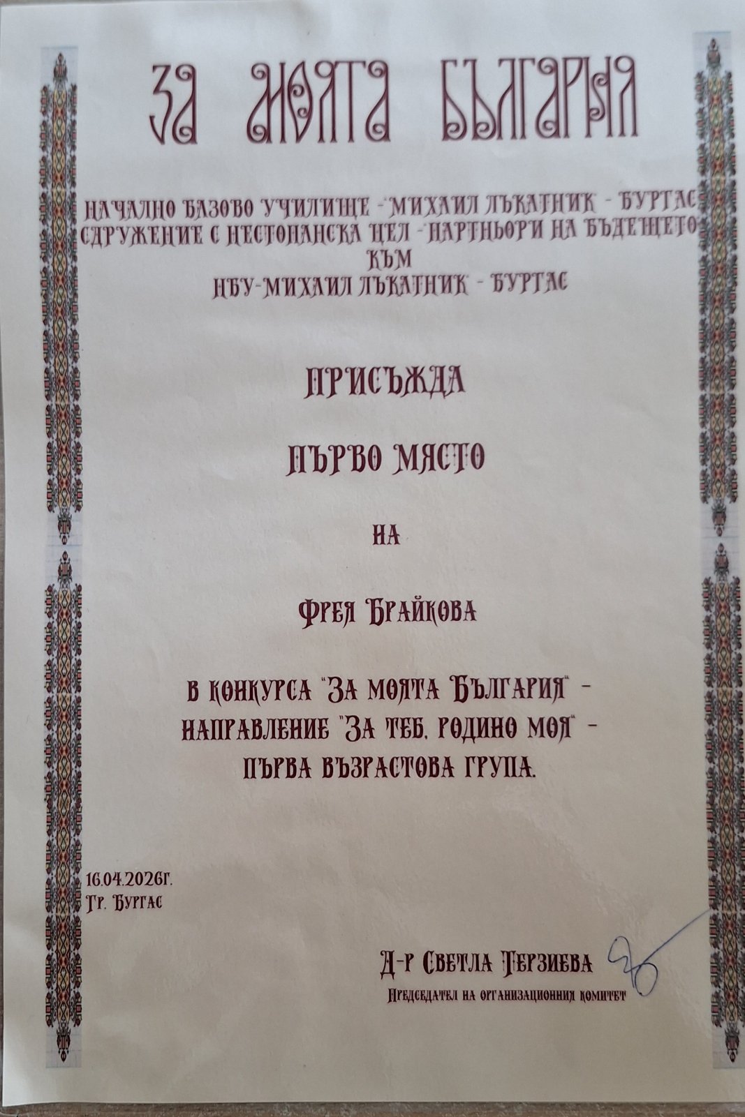 С огромна радост споделяме, че Фрея Брайкова от I “A” клас спечели първо място в конкурса „За моята България“, направление „За теб, родино моя“!